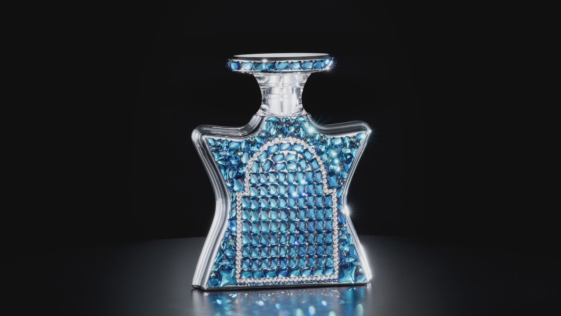 Dubai Blue Diamond’s silhouette bottle and cap features 550 shimmering Swarovski Fanci-Stones in sapphire blue, each stone set by hand for added dimension and shine.